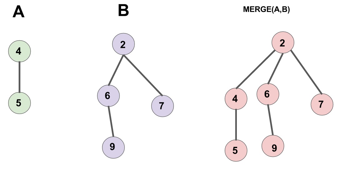 合并两个配对堆的操作很简单,首先令两个根节点较小的一个为新的根节点,然后将较大的根节点作为它的儿子插入进去.(见下图)