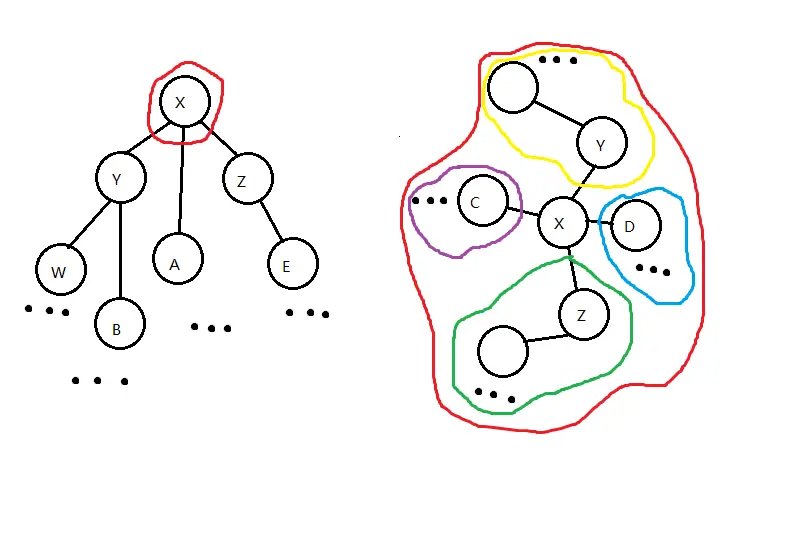 然而,如果我们选的点它在 Top Tree 中簇信息包含 𝑥 x 的节点个数很少,也就是说使它的信息尽可能晚地加入簇中,我们单次操作的时间复杂度就会有一个很大的提升.如图.