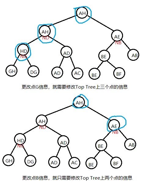 现在我们在维护时要对 𝑇 T 中某个点 𝑥 x 的权值进行修改,很明显,我们就需要更改 Top Tree 中所有簇信息包含 𝑥 x 的节点信息,这样做单次时间复杂度会是 𝑂 ( 𝑛 ) O ( n ) 级别的.