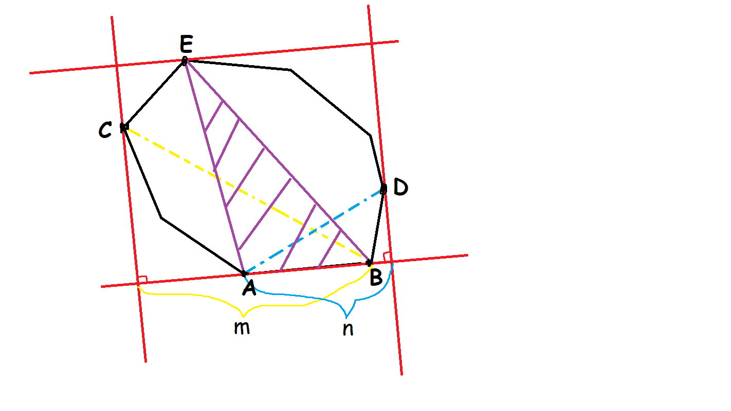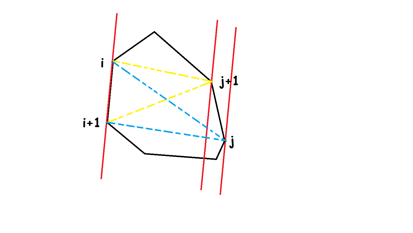 枚举过程中,对于每条边,都检查 j+1 和边 (i,i+1) 的距离是不是比 j 更大,如果是就将 j 加一,否则说明 j 是此边的最优点.判断点到边的距离大小时可以用叉积分别算出两个三角形的面积(如图,黄、蓝两个同底三角形的面积)并直接比较.