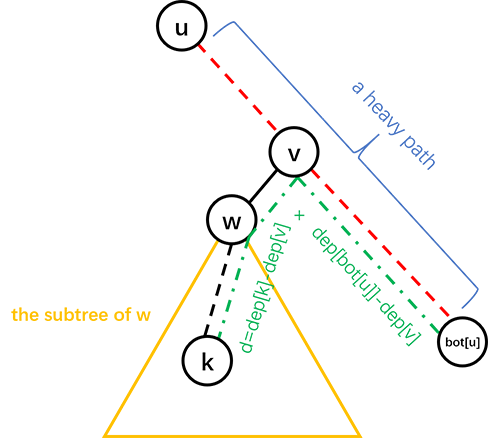 我们考虑求出其所在重链的结点并且按照深度列入表格.假设重链长度为 𝑑