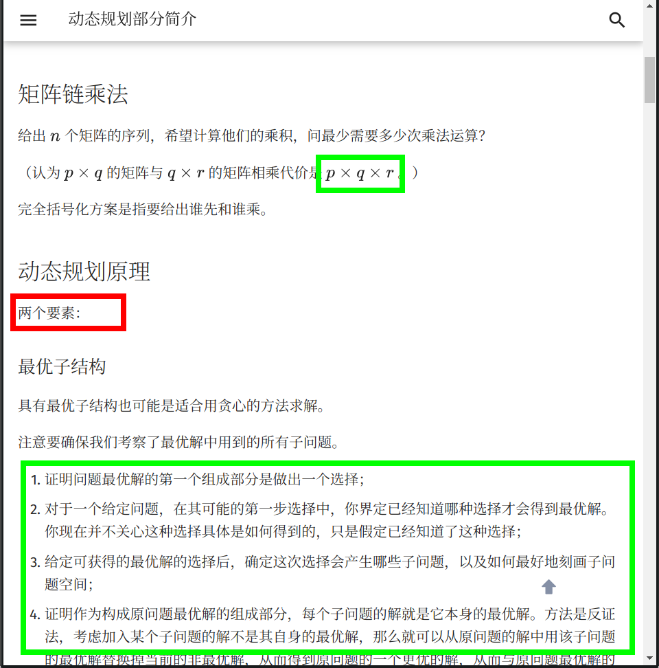 注意我们描述 乘法 的时侯一般使用 \times 或者 \cdot,特殊情况(如卷积)下会使用 *(也可以写成 \ast).标题是简洁的词组,但我们不希望正文部分由词组拼凑而成.上图中「两个要素」,建议更改为「动态规划的原理具有以下两个要素」,上下文保持连贯.可取的地方是,适当使用 有序 列表可以更有条理地表述内容.再次提醒,在使用列表的时侯,每一项如果是一句话,需要在末位添加 标点符号.有序列表通常添加分号,在最后一项末位添加句号;无序列表统一添加句号.