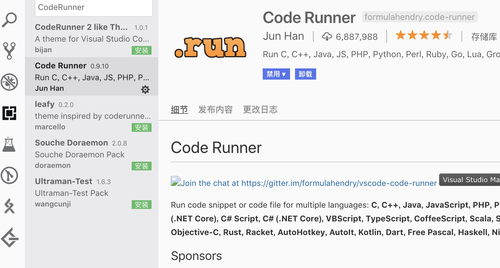 安装的方式是在扩展商店搜索 Code Runner 并点击 Install;或者前往 Marketplace 并点击 Install,浏览器会自动打开 VS Code 并进行安装.