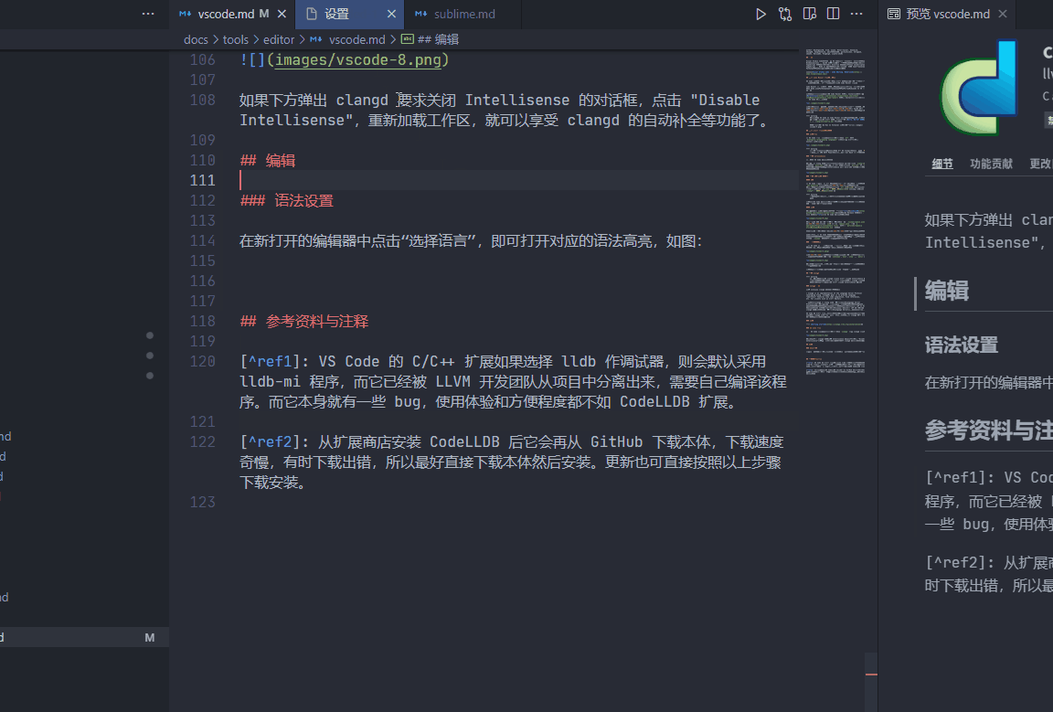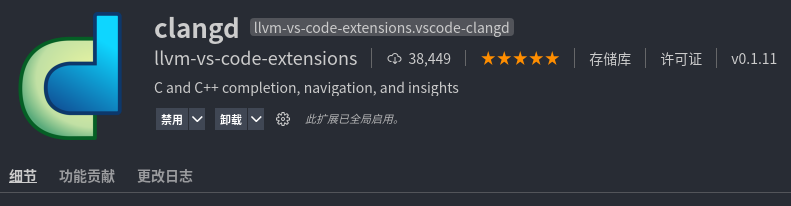 由于功能冲突,安装 clangd 扩展后 C/C++ 扩展的 IntelliSense 功能将被禁用(调试等功能仍然使用 C/C++ 扩展).如果 clangd 扩展的功能出现问题,可以查看是否禁用了 C/C++ 扩展的 IntelliSense 功能.