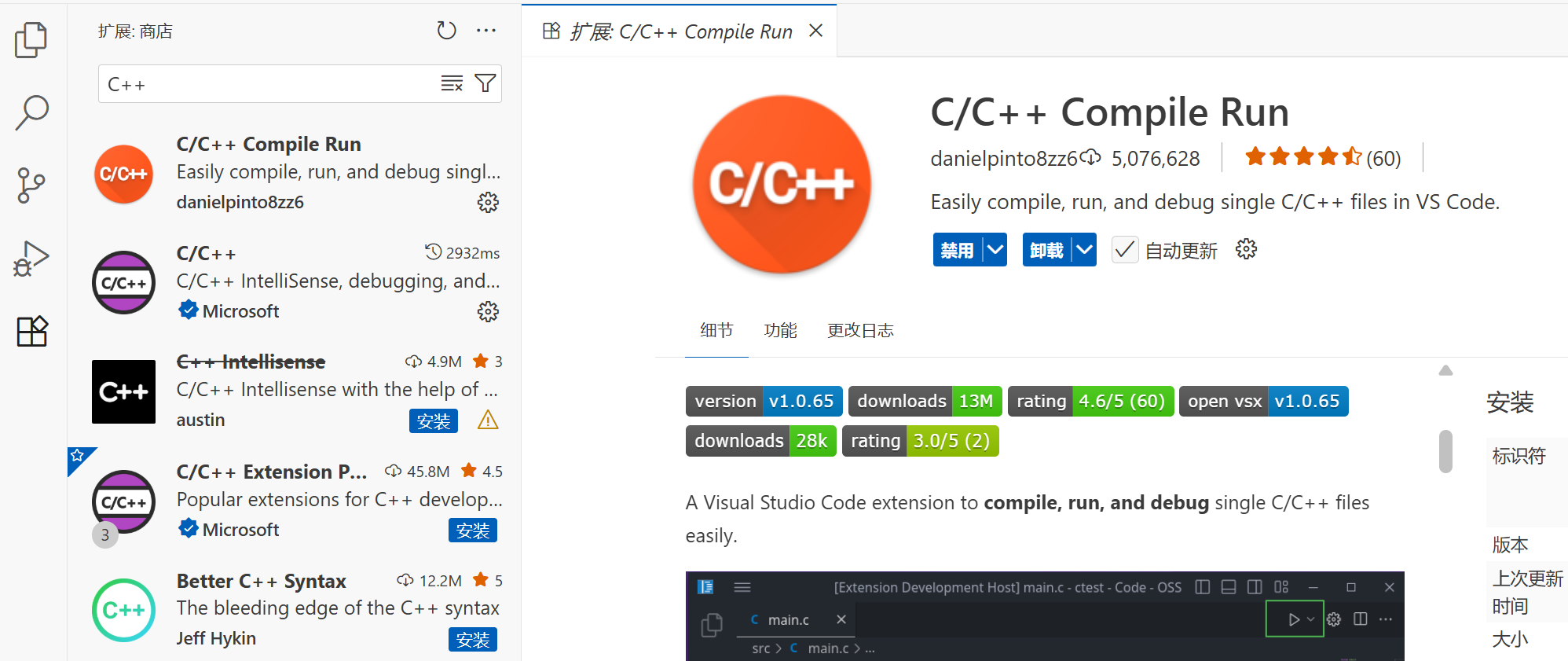VS Code 安装并配置扩展后可实现对 C/C++ 的支持,但配置过程比较复杂.一个简单的编译与运行 C++ 程序的方案是安装 Code Runner 扩展.
