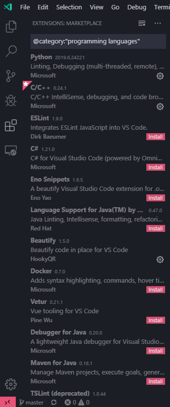 在 VS Code 中打开扩展商店,在搜索栏中输入 C++ 或者 @category:"programming languages",然后找到 C/C++,点击 Install 安装扩展.