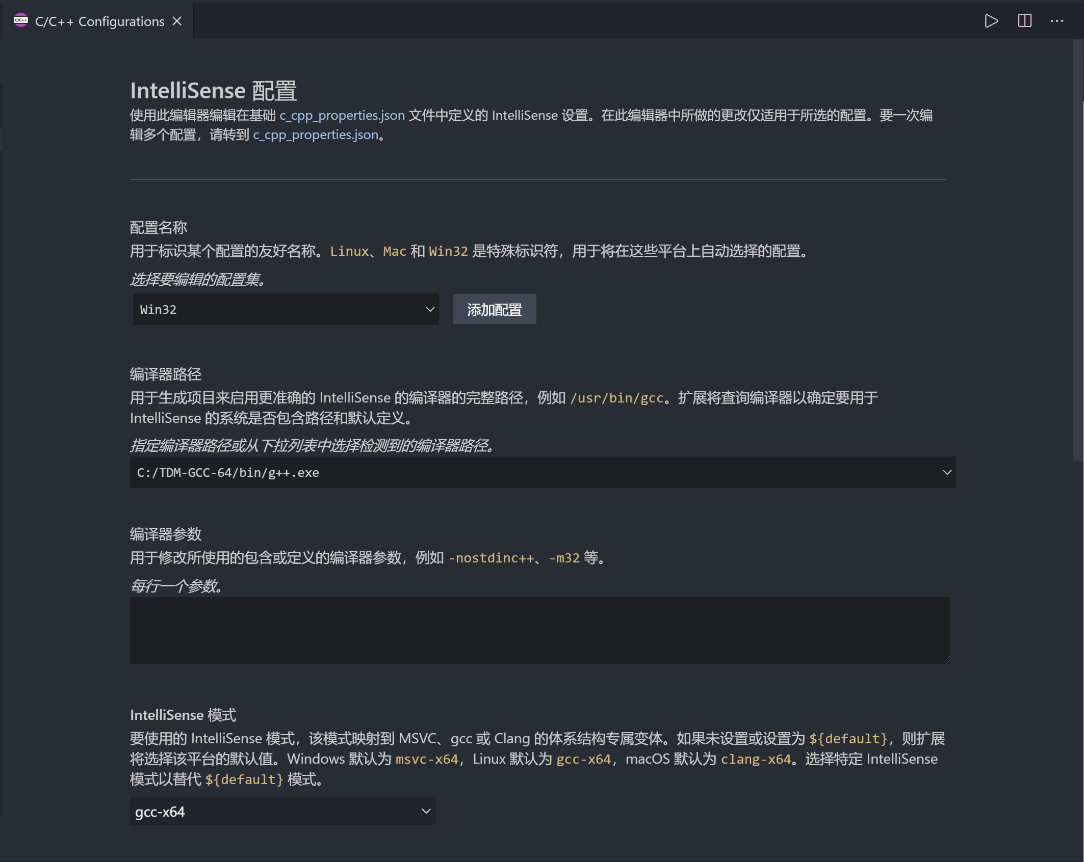 如果你使用 Clang 编译器,在「IntelliSense 模式」中选择 clang-x64 而非默认的 msvc-x64;如果你使用 G++ 编译器,选择 gcc-x64 以使用自动补全等功能.否则会得到「IntelliSense 模式 msvc-x64 与编译器路径不兼容.」的错误.
